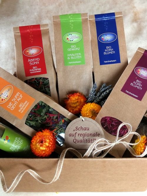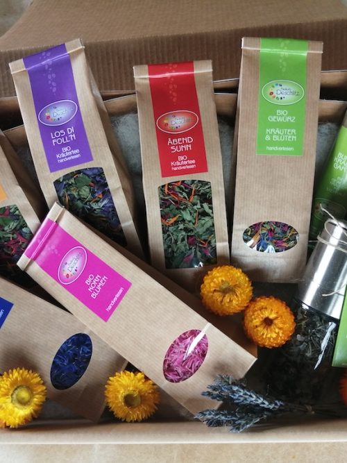 Aromatisch, würzig, blumig… umweltfreundlich verpackte Geschenkideen mit unterschiedlichen Bio Kräutertee- und Gewürzkräutermischungen oder Blütenblättern.